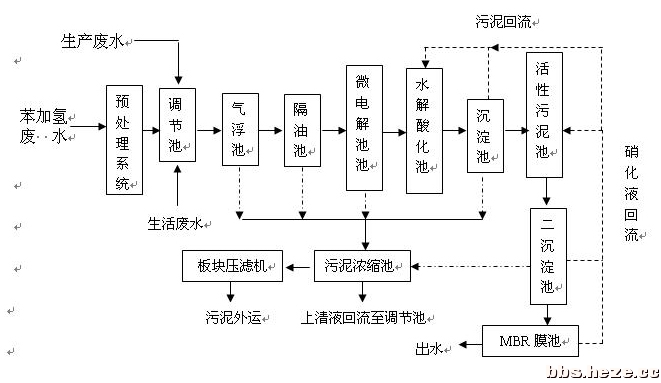工藝流程簡述:來自苯加氫裝置的生產廢水經預處理裝置處理后進入調節(jié)池與其它生產裝置廢水均質混合,用泵提升至隔油沉淀池,去除大部分浮油和懸浮物,浮油收集后回收利用。然后進入氣浮系統(tǒng),再次去除廢水中部分油類和大部分的懸浮物;氣浮系統(tǒng)出水進入微電解池,利用生物鐵具有微電池反應、絮凝作用和親鐵細菌的生物降解等綜合作用,可改變廢水中部分污染物的分子結構,把難降解的大分子有機物轉化為小分子有機物,降解部分有機物的毒性,為下一步生化處理創(chuàng)造有利條件。微電解池底部安裝鼓氣攪拌裝置,用來除去廢水中的氣體。微電解池出水進入水解酸化池,在缺氧條件下,利用厭氧菌將廢水中難降解物質降解為溶解性的物質,大分子物質降解為小分子物質。水解酸化池出水后進入活性污泥池,在好氧條件下,利用好氧菌去除大部分有機物,經污泥回流泵將活性污泥及沉淀池內污泥回流至反硝化池進行反硝化,去除去廢水硝酸鹽,達到去除氨氮的目的?;钚晕勰喑爻鏊M入MBR膜池, MBR膜組件自身配置了空氣曝氣系統(tǒng),用于提供生化所需的需氧以及用于抖動膜絲,減輕膜污染。處理后的泥水混合液在清水泵(或虹吸)的抽吸作用下,清水進入MBR中空纖維膜絲,再匯集于MBR集水管后由清水泵抽出,幾乎細菌及懸浮物均被截流在好氧曝氣池中,因此省去了沉淀池,并使出水達到懸浮物接近于零的優(yōu)良水質。同時,MBR中0.1微米的中空纖維膜可以阻止細菌的通過,將菌膠團和游離細菌保留在生化反應器中,大大提高了反應器內的污泥濃度,強化生化生化效果。