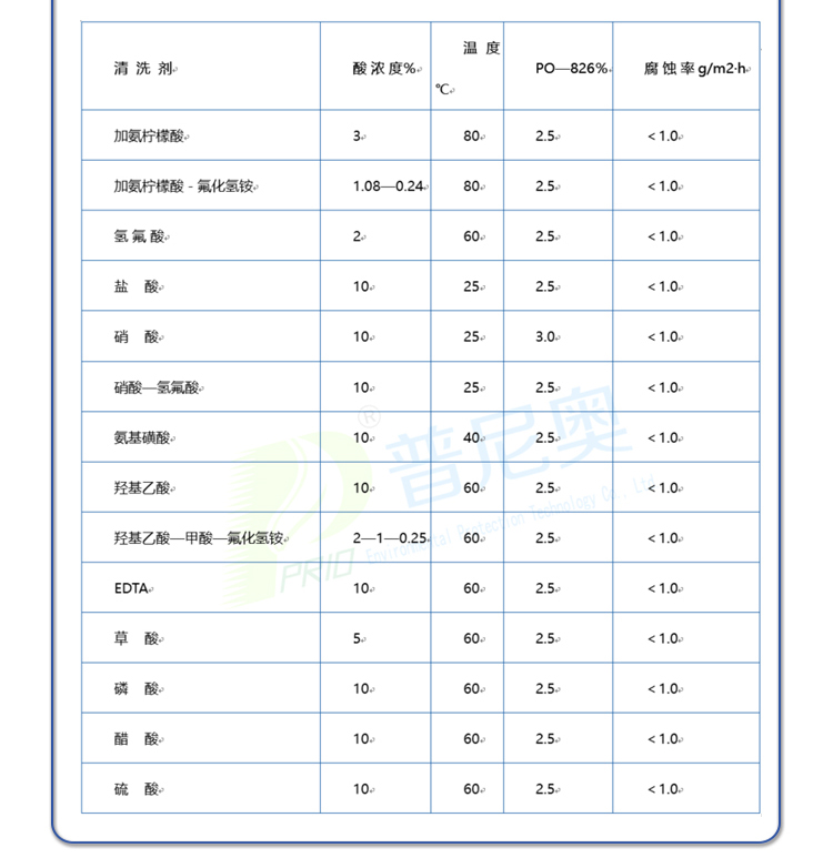 根據(jù)選定的酸種按附表確定PO-826的用量。使用步驟:連接好清洗系統(tǒng),在配液箱中加入計(jì)量的水-加入計(jì)量的PO-826緩蝕劑攪拌均勻-邊攪拌邊加入計(jì)量的濃酸混合均勻-注入設(shè)備,按常規(guī)的化學(xué)清洗工藝進(jìn)行清洗。PO-826在各種介質(zhì)中的添加量和緩蝕效果(20號(hào)鋼)